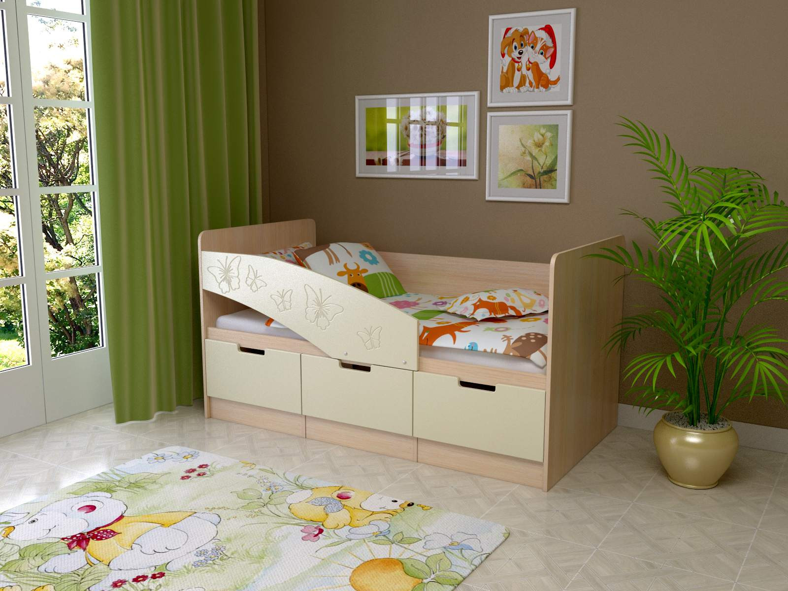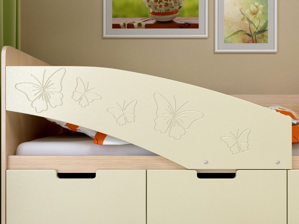 Кровать "Ириска-8" МДФ  - это кроватка с оригинальной фрезеровкой, которая придется по душе Вам и Вашему ребенку. Красивые бабочки будут порхать на бортики, и радовать глаз.   Все 3 ящика выкатные, больше не стоит волноваться о ручках, которые могут мешать. Идеальная кроватка для Ваших детей. Направляющие ящиков роликовые.