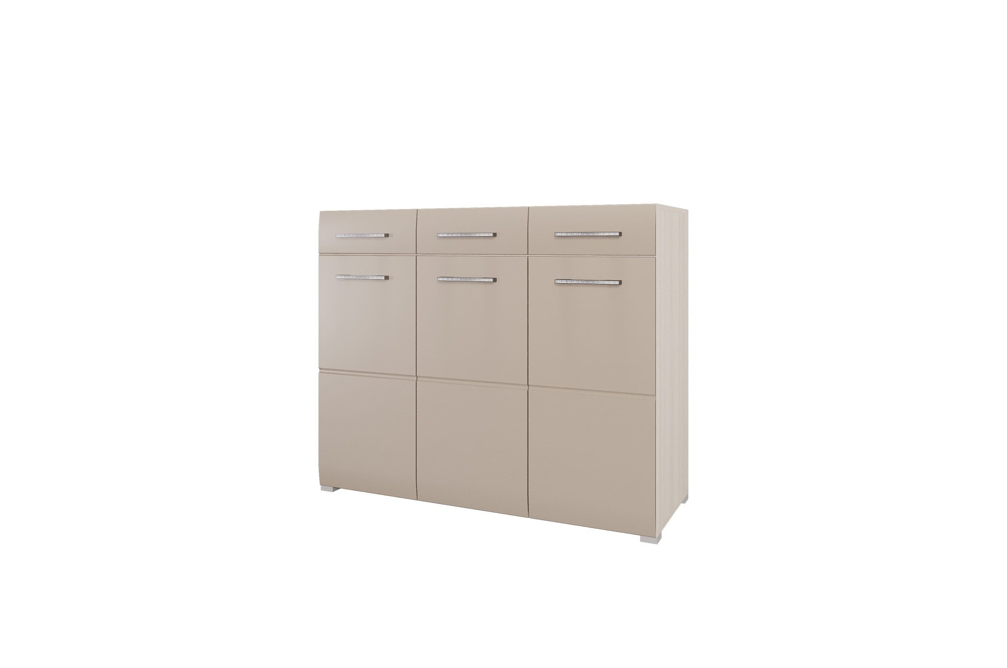 Особенности комода: Удобный и вместительный. На глянцевых фасадах горизонтальная фрезеровка. Отлично подойдёт для гостиной, спальни, прихожей или кабинета. Класс токсичности материалов – Е1. Кромка корпуса ПВХ 0,4 мм, производитель Kronospan. Роликовые направляющие бренда BOYARD. Содержит три выдвижных ящика для мелочей и два больших шкафчика с полками.